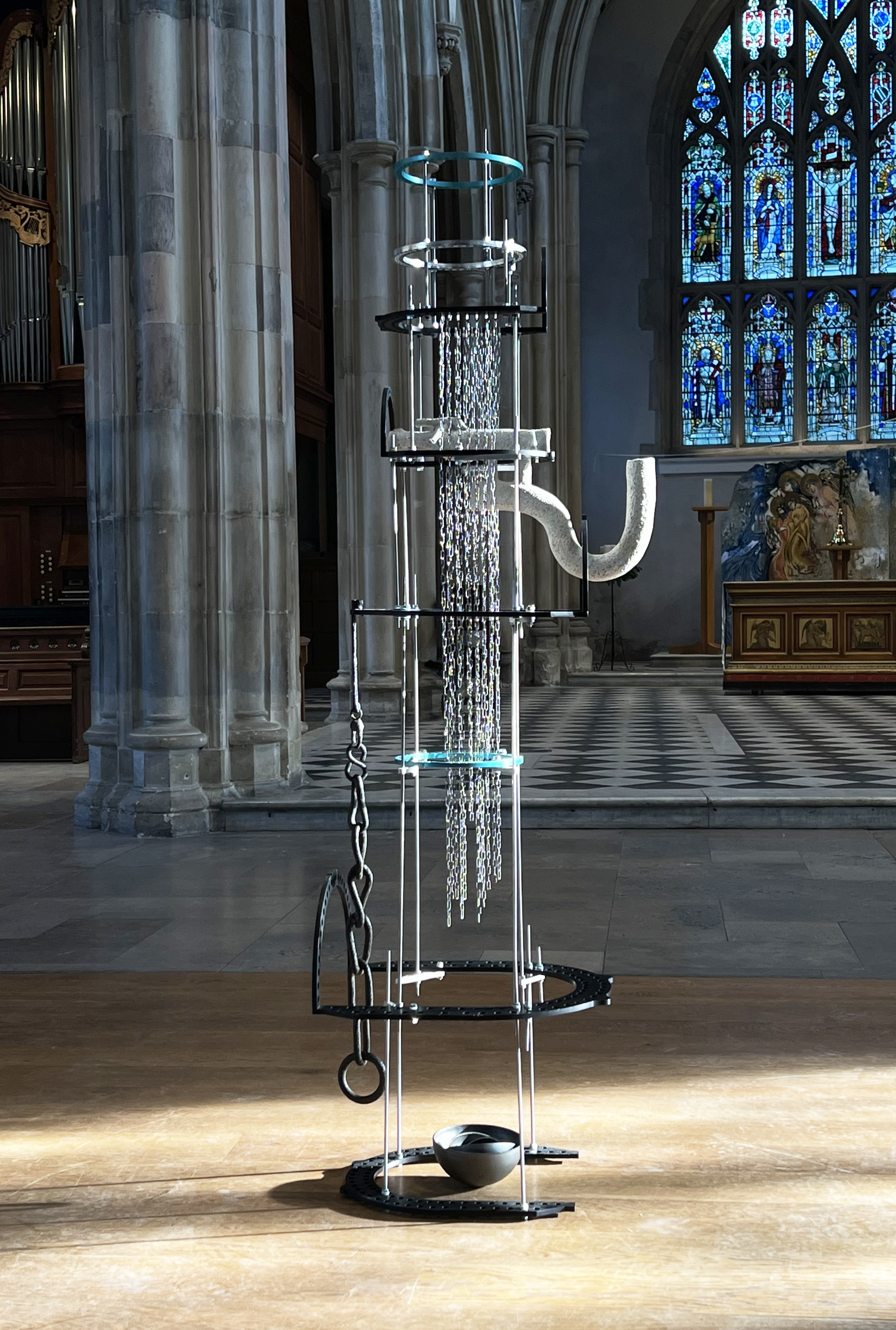 External fixators, Waterjet cut aluminium, wrought iron, chain, threaded steel rod, glazed stoneware